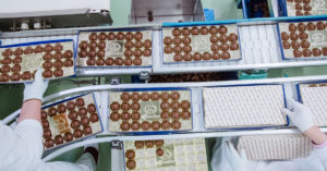 По соседнему конвейеру плывут шоколадные пирамидки — будущие конфеты. Вначале они попадают под водопад глазури, а потом, уже сверкающие, едут по длинной ленте конвейера, успевая охладиться в холодильном шкафу до того, как попадут в фасовочное отделение. Здесь, как в футуристическом фильме, над лентой мелькают металлические «руки» умного робота, оборудованные вакуумными насадками. Они ловко разбирают аппетитные конфеты и расставляют их в быстро проезжающие по соседней ленте коробки. На концерне «Бабаевский» большинство процессов автоматизировано, а операторы только управляют и следят за процессом.