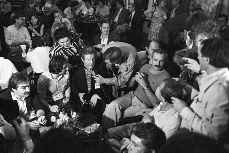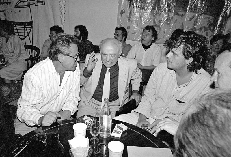 Ролан Быков беседует с гостями ХV Московского международного кинофестиваля Милошем Форманом (слева) и Эмиром Кустурицей (справа) во время встречи в Профессиональном клубе кинематографистов (ПРОК), 1987 г.