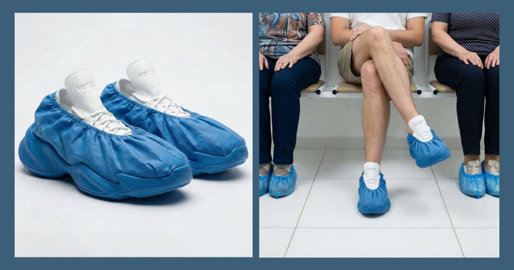 Дизайн придумало бюро Verlab. Их кроссовки-бахилы, если смотреть на рендеры, выглядят не как аксессуар, а как встроенная часть дизайна. То есть бахила не надевается поверх — она уже «пришита». Получается обувь, которая заранее выглядит так, будто вы только что откуда-то вышли и забыли снять. И, что важно, не собираетесь этого делать.