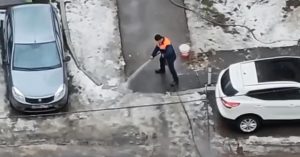 Недавно в Западном Дегунино заметили работника коммунальных служб, который чуть изменил питерский способ, заменив огонь на кипяток, и вышел поливать улицы из шланга. Впрочем, несмотря на всю усердность, с которой мужчина пытается расправиться с заледеневшим снегом, проку от такой уборки мало.
