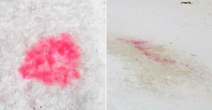Московские собачники стали замечать по всему городу розовый снег — это собачий яд