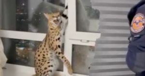 Каково же было удивление сотрудников по прибытии в квартиру на 41-м этаже, когда они обнаружили, что животное, которое им придется вызволять, имеет весьма внушительные размеры. Экзотический кот породы сервал не подпускал к себе никого из мужчин, шипя на них и грозя исцарапать, когда те пытались освободить его из ловушки на месте.