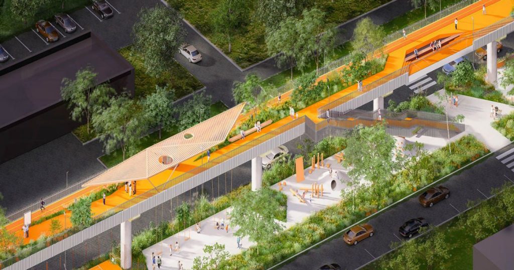Прогулочный маршрут будет длиной всего четыре километра. Бывшие станции станут двухэтажными павильонами с кафе и другой инфраструктурой, а еще на высоте появится беговая дорожка. В очередной раз заявляют, что аналогов такому парку нет во всей России (но в мире, конечно, примеров достаточно — от «Хай-Лайна» в Нью-Йорке до сеульского Seoullo).