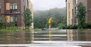 Двор жилого комплекса в Новой Москве затопило, из дома просто так не выйдешь — только в рыбацких сапогах. У предприимчивого мужчины в квартире оказался сап, и Москва на глазах превратилась в Венецию.