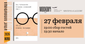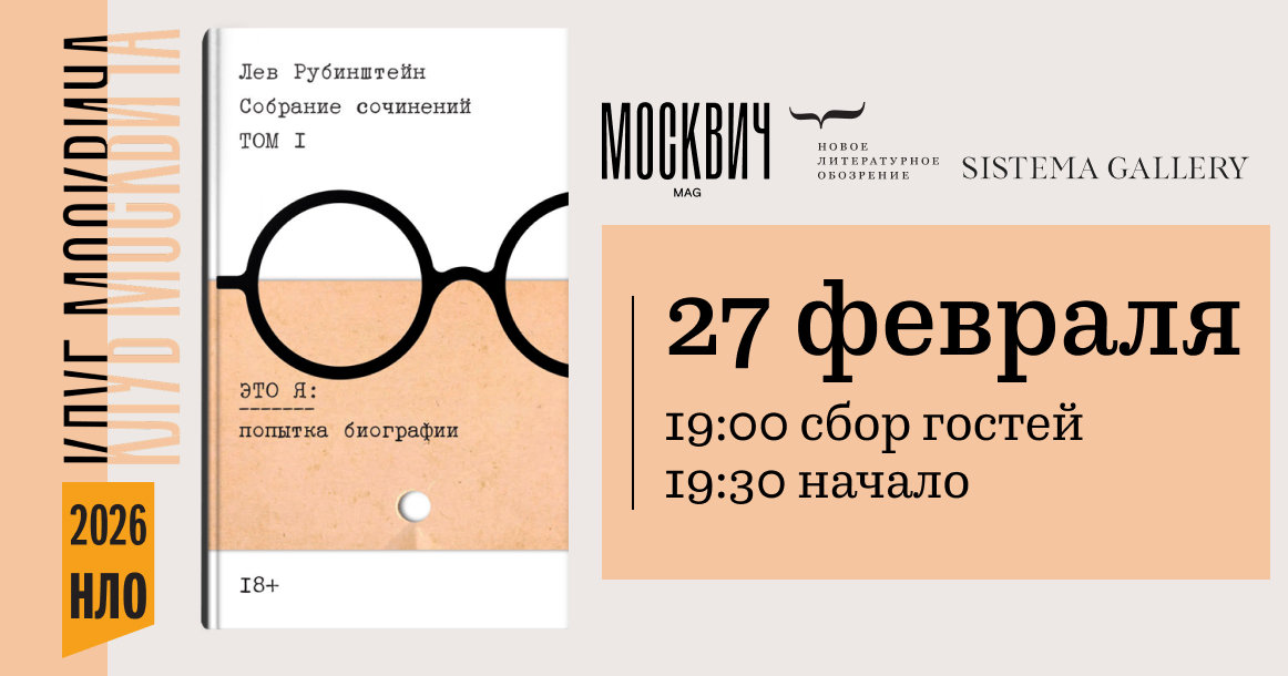 Клуб «Москвича» откроется 27 февраля в 19.00 чтениями текстов Льва Рубинштейна из первого тома «Это я» нового собрания сочинений, вышедшего в издательстве «Новое литературное обозрение». Вечер пройдет в галерее современного искусства Sistema Gallery (Бобров переулок, 4, стр. 4). В чтениях примут участие поэты и драматурги Андрей Родионов и Екатерина Троепольская, поэт и прозаик Данила Давыдов, главный редактор НЛО Ирина Прохорова и издатель «Москвич Mag» Игорь Шулинский.