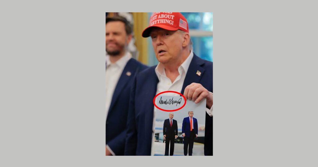 На снимке запечатлены Дональд Трамп и Владимир Путин во время их встречи в Анкоридже. По словам продавца, это то самое фото, подписанное американским лидером, который он показывал в Белом доме спустя неделю после саммита.