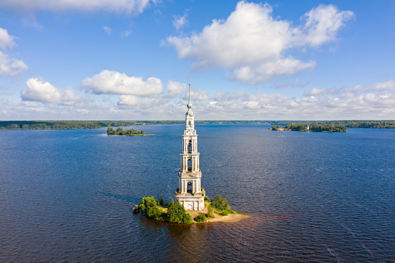 Символ Калязина — высоченная колокольня Никольского собора, которая немым укором торчит в самом центре Волги. Когда перед Великой Отечественной войной Николо-Жабенский женский монастырь взорвали и разобрали по кирпичикам, колокольня устояла (умели же предки строить) и полвека прослужила маяком для проплывающих судов. В конце 1980-х ее фундамент укрепили и даже насыпали вокруг небольшой остров, но местные еще помнят, как детьми на лодках проплывали под каменными арочными сводами.