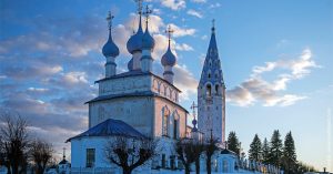 Поразительной красоты здание построено на высоком холме в середине XVIII века: возводили его на средства прихожан, и сразу видно, что со вкусом у них все было в порядке. Изящный, пропорциональный, летящий храм изнутри был расписан местными иконописцами (говорят, впрочем, что руководили работами московские художники Сапожниковы). Роскошный иконостас в главном летнем приделе (на зиму его закрывали, поскольку он не отапливался) стоит отдельного изучения — он дает начальное представление о палехской иконописи, от которой впоследствии отпочковалась знаменитая лаковая миниатюра. Отпочковалась просто потому, что в противном случае иконописцам было бы не на что жить.