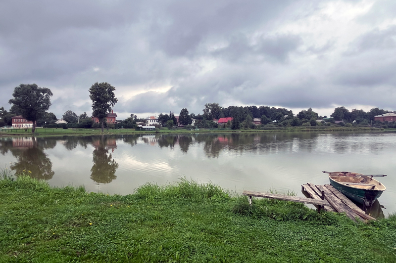 Нахожу свое место силы на импровизированной лавочке-бревне с видом через пруд на великосельский «кремль» — ансамбль церквей XVIII века: храм Рождества Богородицы с пятью зелеными куполами и сохранившимися фресками, зимняя Покровская церковь и 56-метровая колокольня.