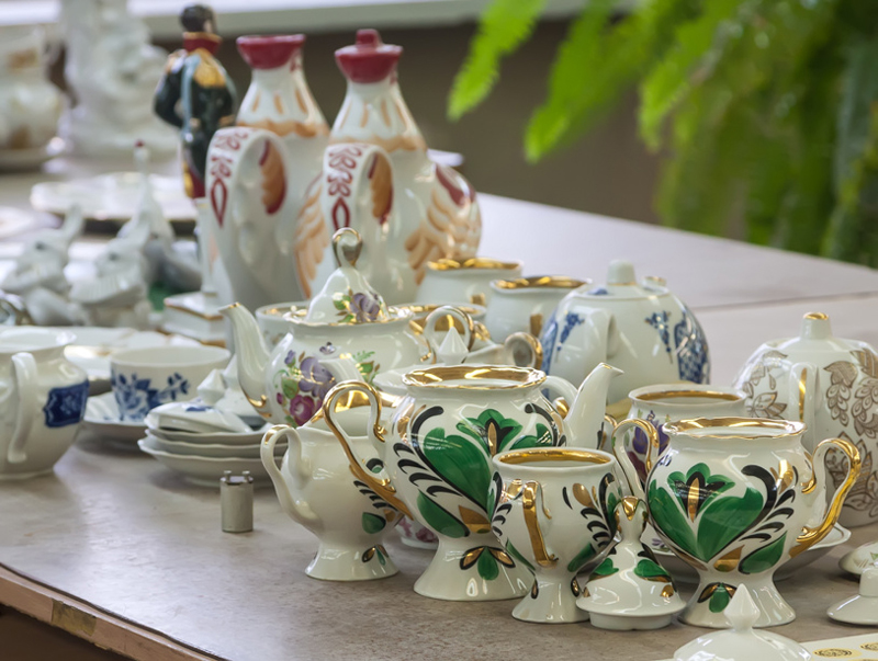 При заводе есть магазин и музей с экскурсиями. Пожилая экскурсовод в строгом костюме а-ля Коко Шанель и тяжелых черных очках рассказала, что вся продукция поставлялась к императорскому двору, так что завод получил право ставить государственный герб. Это был самый статусный фарфор, сейчас его можно увидеть в Эрмитаже. А в музее при заводе поглядеть на сервизы с цветами и букетами, ампирные сервизы с золоченым орнаментом и советский юбилейный фарфор. Все стили росписи, кроме гербов, перекочевали в СССР, когда завод стал называться Дмитровским фарфоровым и вместо дворцовой посуды появились массовые сервизы, агитационный фарфор и юбилейные изделия. При этом сохранились старые технологии, художники и школа росписи. В позднем СССР придумали серию «ягоды» — это тоже почерк Вербилок. Я купила реплику из 1920-х — революционный квадратный чайник-завод и три подставки под яйцо из очень крутого бисквитного фарфора.