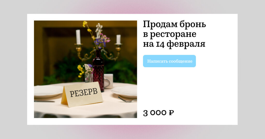 Впрочем, может быть, это красивая легенда для покупателя. В одном из объявлений за 3000 рублей предлагают бронь в Garda на Петровке: 14 февраля, 19.00, два гостя. Продавец прикладывает скрин подтверждения из сервиса, чтобы не было сомнений. В описании почти исповедь: столик бронировали заранее под романтический вечер, но «ближе к дате поняли, что лучше остаться друзьями».