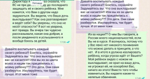 Сначала Ксения (так зовут мать девочки) связалась с родителями обидчицы. Диалог был, судя по скриншотам переписки, довольно уважительным: обе стороны пожелали, чтобы дети дружили и не ссорились. Мать одноклассницы, к которой обратилась Ксения, пообещала поговорить с дочерью, но, видимо, со временем ничего не изменилось, и диалог в вотсапе состоялся еще раз. Опять безрезультатно.