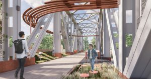 Архитекторы предлагают разбить на мосту газон, сделать искусственный склон, а поверх всего этого установить что-то, похожее одновременно на грибы и на табуретки (правда, на визуализации дети по ним прыгают, а не сидят на них). А над головами гуляющих предлагают пустить «парящую» перголу, словно вплетенную в железные конструкции моста. Правда, превращать ее в висячий сад не планируют.