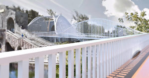 По задумке, новый мост должен получиться в форме закручивающейся волны (хотя на рендерах все это выглядит скорее как скелет морского чудовища, но тут уже кому какая метафора милее). Конструкции ограждений выполнены из алюминиевых сплавов. Длина моста составит 22 метра, а высота — 12 метров.