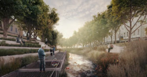 Еще один пример — Лужники, где до появления стадиона был луг, который в половодье заливала Москва-река. Предлагается восстановить и это тоже: экосистема заливных лугов должна стать частью нового пространства для отдыха. При этом планировка Лужников сохранится — предлагают реорганизовать и озеленить большие асфальтовые площади (все рендеры есть на сайте, так что можно посмотреть, как это будет выглядеть).