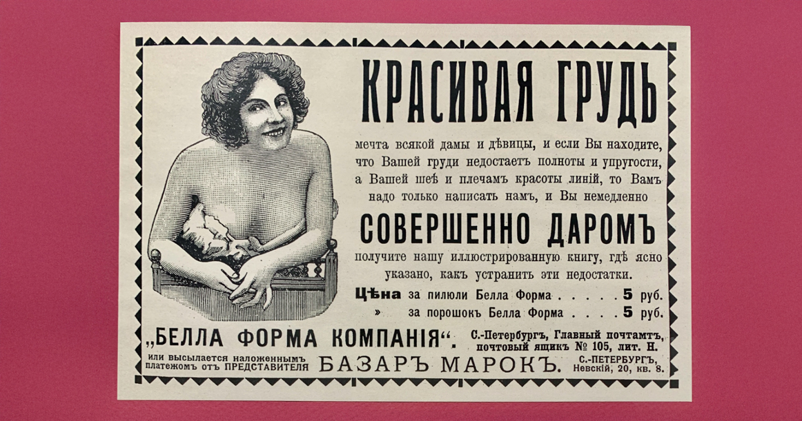 На новой выставке «Как купить счастье» собраны редкие рекламные плакаты, журнальные объявления и упаковки от лекарств и косметики конца XIX — начала XX века. Кто во что горазд: одни обещают самую красивую грудь, другие — таблетку от всех болезней. Экспонаты наглядно показывают, как производители продвигали свои товары: обещали «быстрое решение всех проблем», «без лишних трат» и «тайно, не выходя из дома». В общем-то, все это мы наблюдаем и сегодня, просто продвижение сомнительных продуктов в основном ушло в онлайн.