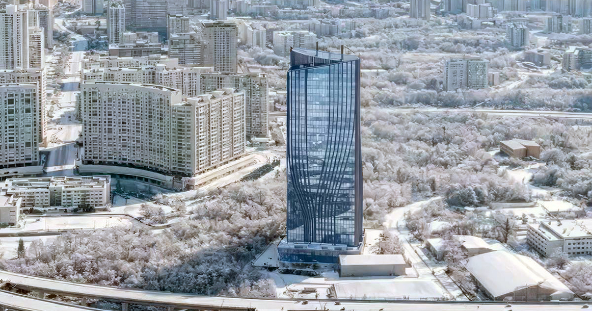 По визуализациям башня, особенно на таких зимних рендерах, выглядит как холодное царство стекла и бетона. На фасаде высотки выделяется «разветвленный» рисунок — он чем-то напоминает факел, ну или растущее дерево. На одном из нижних уровней запроектирована терраса — это уже, можно сказать, обязательный пункт программы для офисов такого класса.