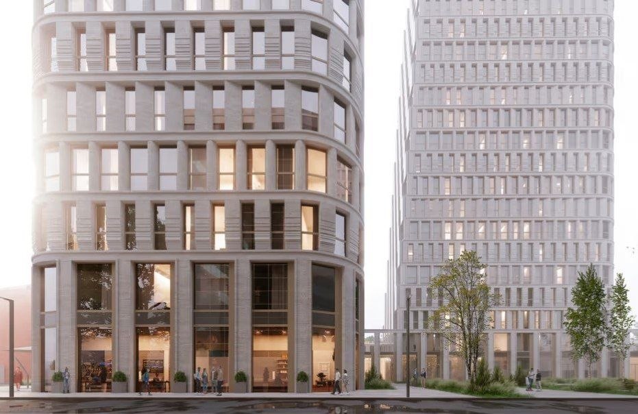 Появилась новая концепция жилого комплекса, разработанная бюро KRNV Architects. Проектом предусмотрены три башни с динамичными срезами и закругленными углами. Фасады решили сделать с разным настроением: часть — с фактурной поверхностью и деталями, которые вроде бы должны соответствовать району, часть — максимально современная, стеклянная. Отдельный акцент — узкие окна.