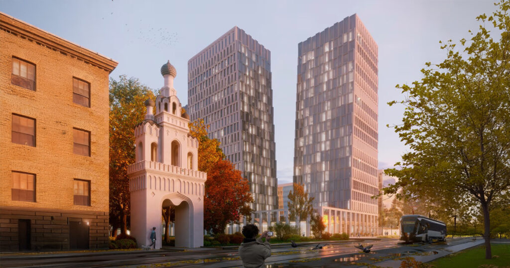 Появилась новая концепция жилого комплекса, разработанная бюро KRNV Architects. Проектом предусмотрены три башни с динамичными срезами и закругленными углами. Фасады решили сделать с разным настроением: часть — с фактурной поверхностью и деталями, которые вроде бы должны соответствовать району, часть — максимально современная, стеклянная. Отдельный акцент — узкие окна.