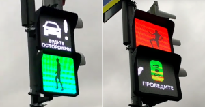 В сообществе «Электронный Журнал “Транспортная Инфраструктура”» сегодня поделились видео с «инновационным светофором» на Бережковской набережной. Вместо стандартных зеленой и красной светодиодных панелей у него установлены дисплеи, которые могут показывать практически любую информацию, а не только красного и зеленого «человечков» или таймер до переключения сигнала.