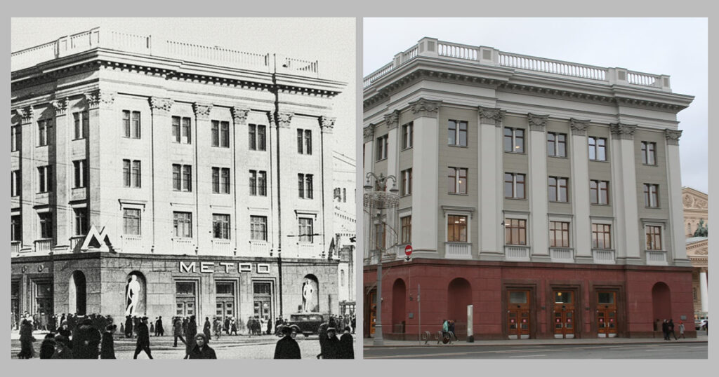 Здание, расположенное в центре Москвы, в 1930-е годы реконструировали по проекту архитектора Дмитрия Чечулина. В ниши по бокам от дверей вестибюля станций метро «Театральная» и «Охотный Ряд» поместили две фигуры: «Физкультурник с мячом» и «Физкультурник с гранатой» по проекту Арменака Степанянца. Этот армянский скульптор специализировался на фигурах атлетов — похожие изваяния его авторства тогда ставили во многих городах СССР.