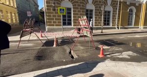 Дорожные рабочие в спешке пытаются залатать дыру на дороге. О причинах внезапного провала грунта не сообщается. Экстренные службы огородили место провала, а объезд по тротуару для безопасности выделили конусами. Пешеходы, которые идут по этому участку Большой Никитской, вынуждены жаться к фасадам.