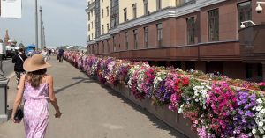 Раньше москвичи сами несли на мост цветы, но мэрия заботится о жителях города и все сделала за них. Теперь обе стороны моста облагорожены многочисленными горшочками с петуниями и другими ампельными растениями всех цветов и оттенков. Только интересно, почему обделили остальные переходы через Москву-реку.