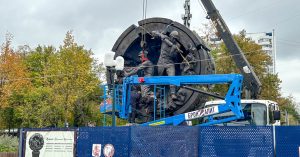 Установка началась еще на выходных. Скульптурная композиция будет расположена примерно посередине нового бульвара, ведущего от павильона метро к парку. Сам парк при этом, напомним, находится на реконструкции (в центральную часть не попасть), нужно обходить.