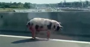 Свинья не выглядит испуганной, такое ощущение, что она просто вышла по своим делам. И это явно не переросток минипиг, а вполне упитанный обычный хряк. Впрочем, весьма воспитанный. Движению автомобилей не мешает, к водителям не пристает, скромно пасется на обочине.