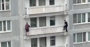 «Молодежь вернула в моду паркур» — так подписали ролик в канале. Хотя трюков на кадрах они не выполняют, смотреть все равно страшно: парни каким-то образом оказались на каждой из выступающих с двух сторон конструкций балкона на пятом этаже — тот, что находился справа, в итоге залез на площадку, а его товарищ зачем-то остался сидеть снаружи. При этом оба как будто высматривали кого-то.
