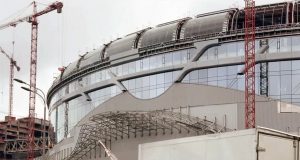 На главном здании «Олимпийского» начали монтировать элементы фасада