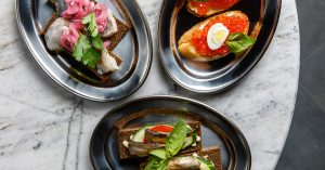 Меню и правда по-прибалтийски насыщено рыбой: бутерброды с сельдью (290 руб.), с щучьей икрой (530 руб.), со шпротами (330 руб.) и с красной икрой (510 руб.), форшмак (320 руб.), паштет из макрели (350 руб.). Несколько блюд из ливера: фирменный печеночный торт и паштет из куриной печени.