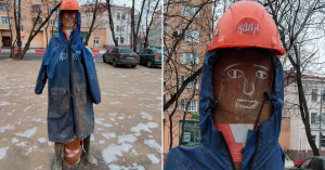 Фотографии очаровательного «железного Коли» появились сегодня в телеграм-каналах. Коля одет в рабочую ветровку и грязные сапоги, а на голове у него оранжевая строительная каска. Вместо шарфа — красно-белая предупреждающая лента.