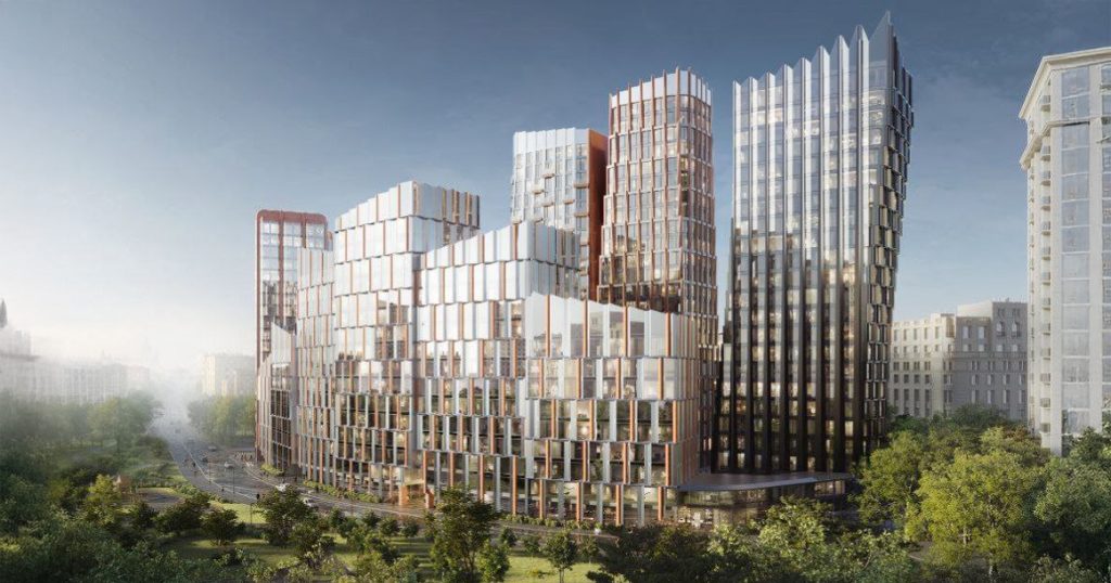 Теперь стало известно, как может выглядеть будущий комплекс. Появились первые визуализации, на которых видно разновысотные корпуса сложной ломаной формы, с углами и гранями — кажется, чтобы их построить, нужно определенное мастерство. В состав проекта из восьми корпусов включены и малоэтажные здания. Над концепцией работало бюро Gafa.