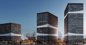 Разноэтажные офисные башни с основанием из натурального камня свяжут ландшафтный парк с территорией офисного квартала. За счет панорамного остекления и высоких восьмиметровых потолков вид на парк Ходынки станет частью интерьера этих башен.