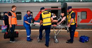 Резервный состав №902 остановился на Киевском вокзале. На месте работают бригады скорой помощи со всем необходимым медицинским оборудованием — специалисты уже оказывают пострадавшим медпомощь.