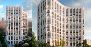 Клубный дом построят во дворе между Брянской и Киевской улицами, недалеко от Можайского Вала. У сталинских домов и стеклянных бизнес-центров появится 14-этажный белоснежный сосед с окнами-арками, которые нынче очень популярны. Вообще авторы проекта этим архитектурным элементом сильно увлеклись — фасады будут состоять в общей сложности из 343 арок разной ширины. На сайте жилого комплекса пишут, что проект вдохновлен «итальянской архитектурой 1930-х годов» — и действительно заметно влияние архитектуры времен итальянского фашизма (привет Дворцу итальянской цивилизации?).