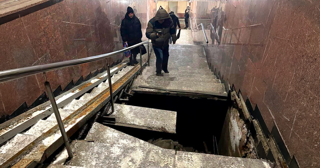 Фото обрушения опубликовал сегодня утром канал «Что там, Москва?». На снимке видно, что на выходе из подземника образовалась полноценная дыра шириной в несколько ступеней — расстояние приличное, просто так не перепрыгнуть. Обойти препятствие можно разве что только по части лестницы с пандусом. Что, как видно на фото, и делает один из пассажиров.