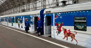 Такая акция проходит ежегодно с 2021-го. Состав поезда периодически менялся, сейчас в резиденцию на колесах входят вагон-приемная с ледяным троном, вагон «Сказочная деревня» для игр и квестов, вагон-лавка с сувенирами, вагон-ресторан, а в этому году еще добавился вагон «Кукольный театр» для проведения представлений. Поезд украшен гирляндами, вагоны расписаны снежинками, елками и другими тематическими картинками, а на окнах уже нарисованы морозные узоры. Билетов в купе или плацкартный вагон на данный рейс не предусмотрено — среди пассажиров только сказочные помощники Деда Мороза.