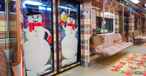 В этот раз на двери белого состава наклеили машущих руками снеговиков, новогодние шарики, елки, снежинки и т. д. Вдохновлялись дизайнеры, судя по всему, праздничной «Трубной».