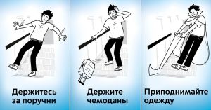Пассажиров на эскалаторах просят держаться за поручни, приподнимать одежду, которая иначе может застрять, держать детей за руку или на руках. Есть и чисто туристический плакат — с просьбой держать чемоданы, чтобы они не покатились вниз. Видимо, бывают и такие случаи.