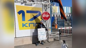 На КПП в Останкино мужчина стоит с плакатом против Овсянниковой
