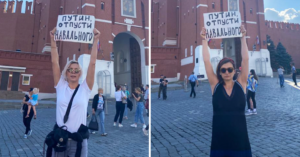 Обе артистки вышли к Спасским воротам и по очереди сфотографировались с плакатом «Путин, отпусти Навального».