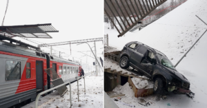 Иномарка пробила забор и рухнула прямо на электропоезд.