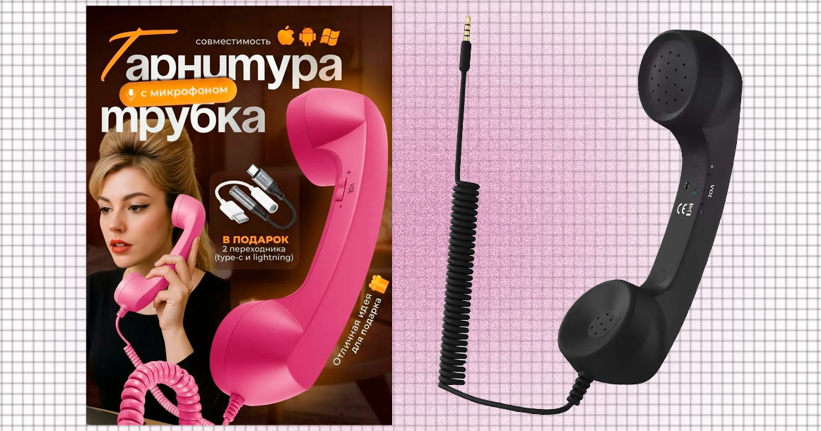 На маркетплейсах этот товар можно найти по ключевым словам «ретротрубка», «винтажная телефонная трубка» и «ретрофон». Судя по описанию в карточке товара, это не просто декорация, а полноценная гарнитура: микрофон, динамик и разные варианты подключения (встречаются модели с USB, Type-C и даже Lightning — старенький айфон потянет).