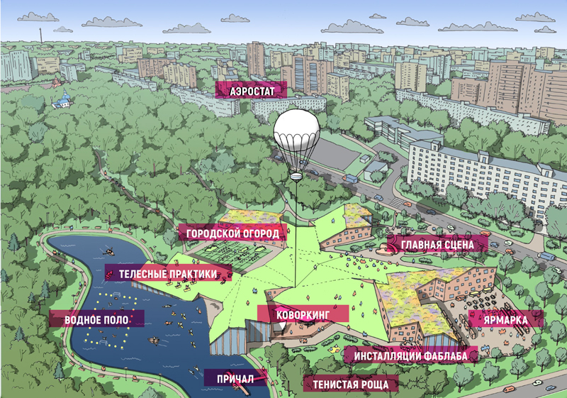 «После сноса заброшенного здания Ховринской больницы ведутся дискуссии, как использовать освободившуюся территорию. Правительство Москвы планирует застроить площадку многоквартирными жилыми домами. Однако, учитывая нехватку на северной окраине Москвы общественных пространств и почти полное отсутствие досуговой инфраструктуры для детей и молодежи, целесообразнее будет создать там современное общественное пространство — социально-культурный центр и парк», — говорится в пресс-релизе архитектурной школы МАРШ, где 21 августа состоится презентация проекта «Ховринка». В описании проекта изображен большой парк с водоемом, лужайкой, городским огородом, зоной для коворкинга, площадкой для запуска аэростата, ярмаркой, сценой и, конечно, деревьями. Зимой тут можно будет кататься на санках, коньках и лыжах, пить глинтвейны и чаи на ярмарке и просто гулять.