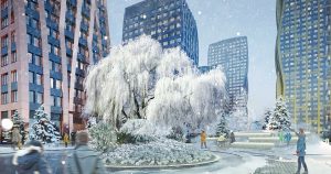 Несмотря на то что называют это парком, деревьев на рендерах показано довольно мало. Зато изображено очень много различных трав и кустарников, так что напоминает все это скорее «Зарядье», чем Central Park.