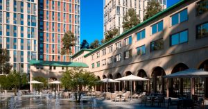 Благоустройство для квартала разработало британское бюро Gillespies. Тут мы видим бульвар с сухими и обычными фонтанами, озеленение, лавочки и детские площадки. Словом, ничего необычного. Проектом предусмотрены два детских сада с прогулочной зоной на крыше — вот на это мы бы посмотрели.