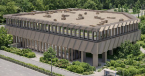 Судя по картинкам, это будет приземистый, почти квадратный двухэтажный объем, поднятый на колонны. Здание выглядит весьма брутально, но и сам рендер как будто не проработанный (возможно, это не последний вариант). По периметру здания идут вертикальные витражи, сверху — зубчатый, ломаный карниз, а нижний ярус оформлен диагональными панелями. На одном из рендеров хорошо видно, что объем фактически нависает над вестибюлем метро «Войковская» (даже удивительно, казалось, что такая застройка вплотную осталась в прошлом).