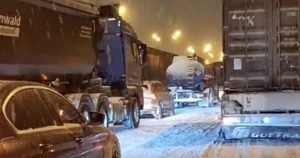 Телеграм-канал «Осторожно, новости» показал впечатляющие кадры, на которых вереница фур стоит в пробке на МКАД (в районе Можайки). Кажется, что в той длиннющей пробке не было вообще никаких других машин, кроме грузовиков. Телеграм-канал писал, что фуры не могли забраться на подъем из-за заснеженных дорог и метели.